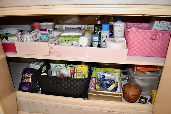 A bancada deste WC estava com excesso de coisas e o móvel por debaixo do lavatório estava mal organizado. O que fiz foi selecionar os artigos pelos diferentes tipos e arruma-los em pequenas caixas que a cliente já possuía. Assim, rentabilizei o que havia e tornei tudo muito mais fácil de encontrar e usar em apenas 2 horas. Diga lá se não dá gosto ter as suas coisas arrumadas desta maneira, heim?